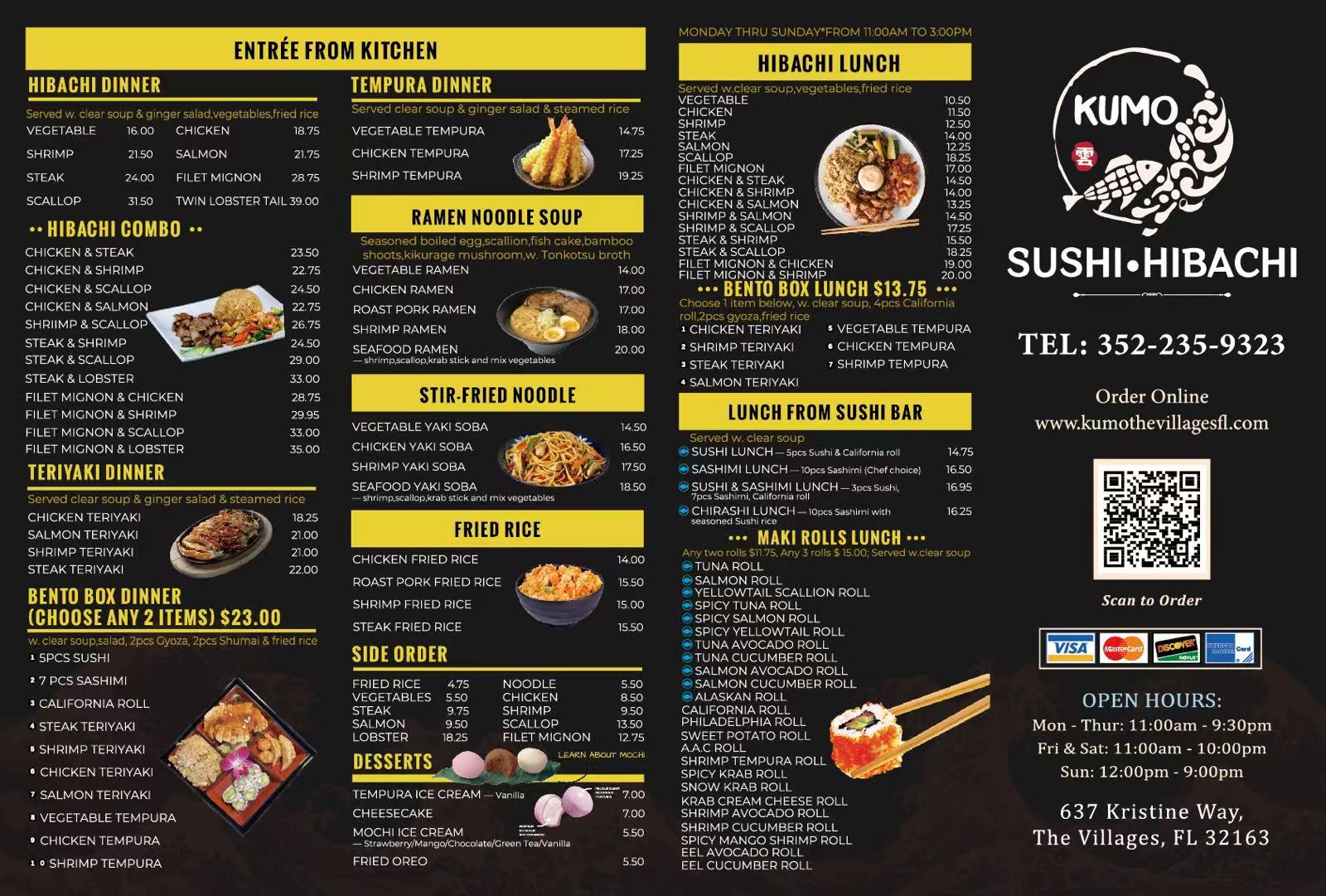 Menu Contact Us Mon - Thur 11:00 AM - 9:30 PM Fri - Sat 11:00 AM - 10:00 PM Sun 12:00 PM - 9:00 PM 352-235-9323 637 Kristine Way, The Villages, FL 32163 FollowFollow
